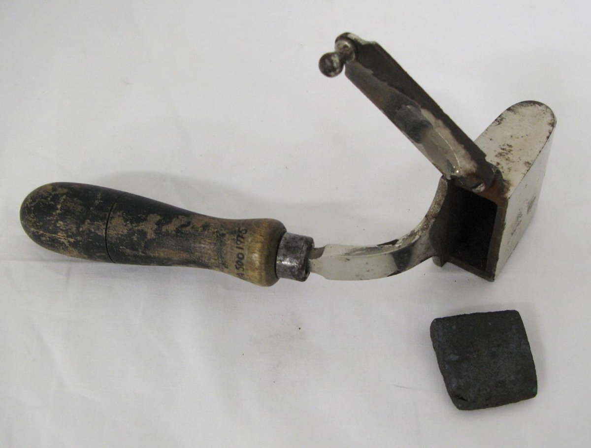 Gljáhúðaður með svörtu tréskafti. Innan í var tunga sem hituð var. Trúlega notaður á ferðalögum til að strauja flibba og líningar. Eigandi Þórunn Hallsdóttir.