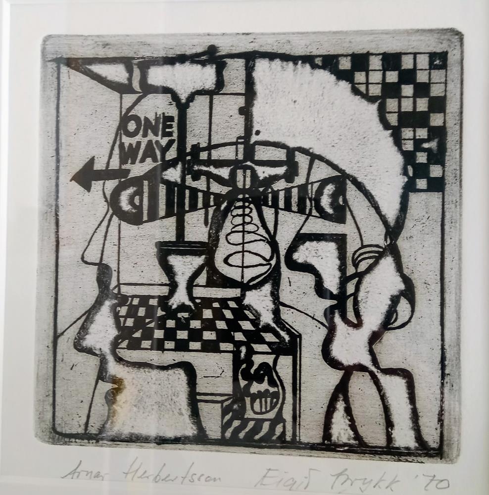 Áletrun: Eigið þrykk ´70. Á myndina er prentað ONE WAY