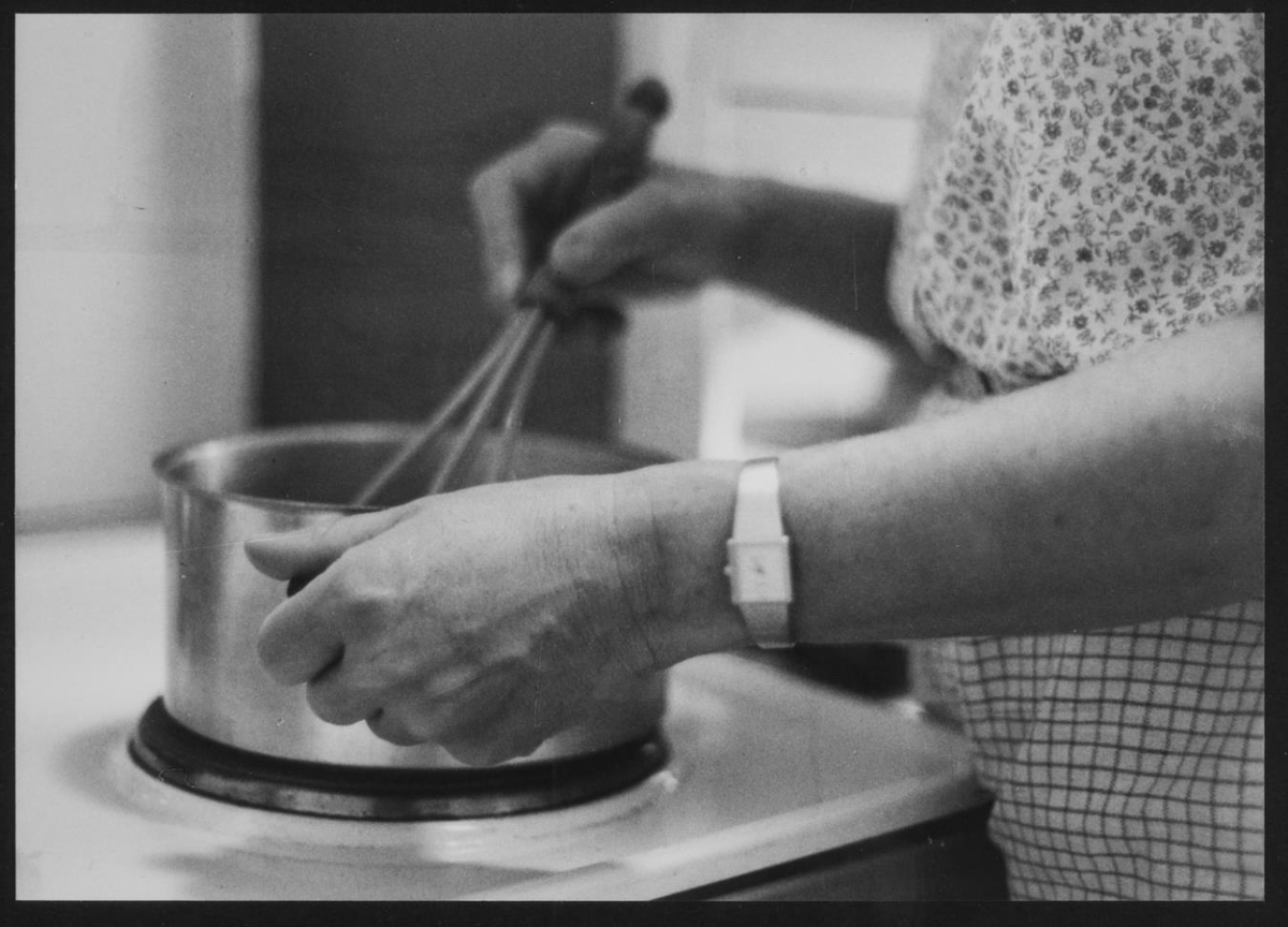 Konur - Heimilisstörf. Kona hrærir í potti á eldavél.