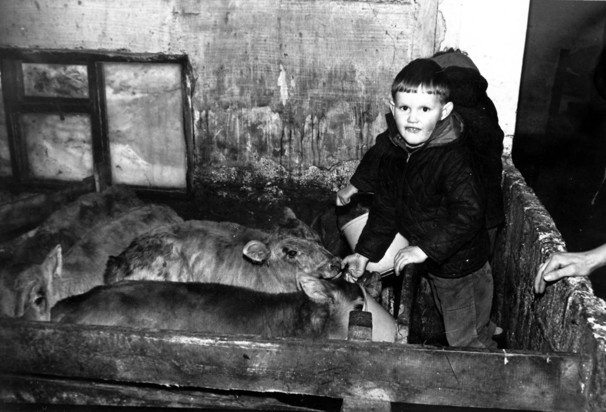 Ungur vinnumaður (bóndasonur) að gefa kálfum undanrennuna.