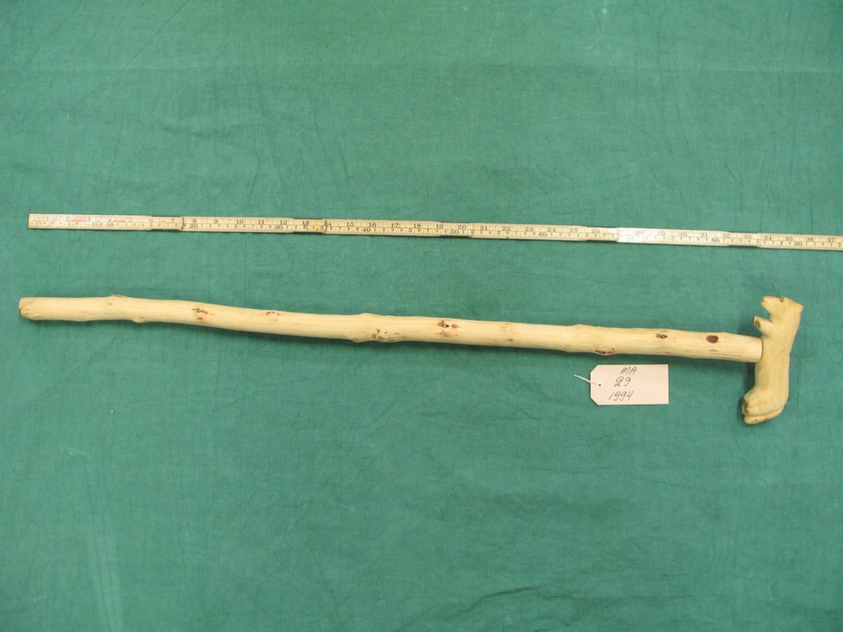 Göngustafur úr grönnum viðarstofni. Útskorinn hestur á handfangi. Smíðaður af föður gefanda.