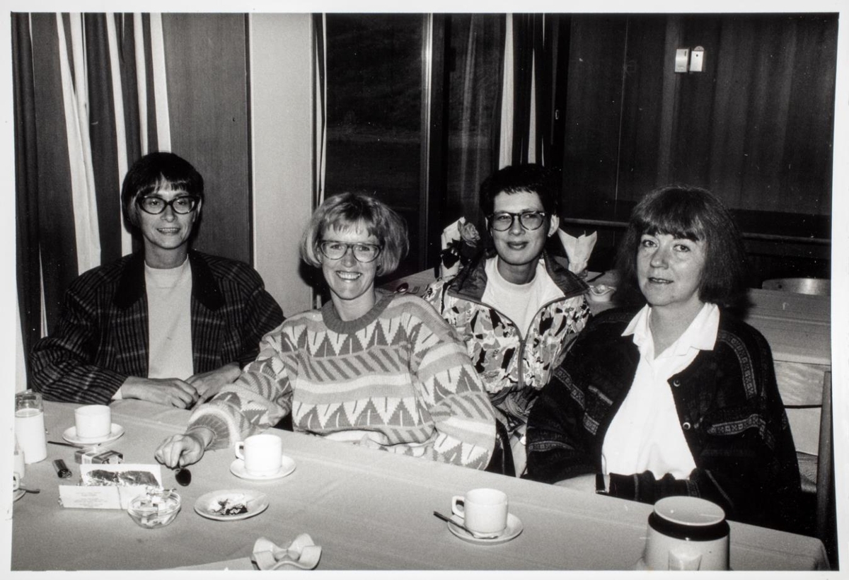 Kvennasmiðjan Sauðárkróki. Stofnfundur. 19. júní 1990. Fjórar af fimm stjórnarkonum sitja við borð.