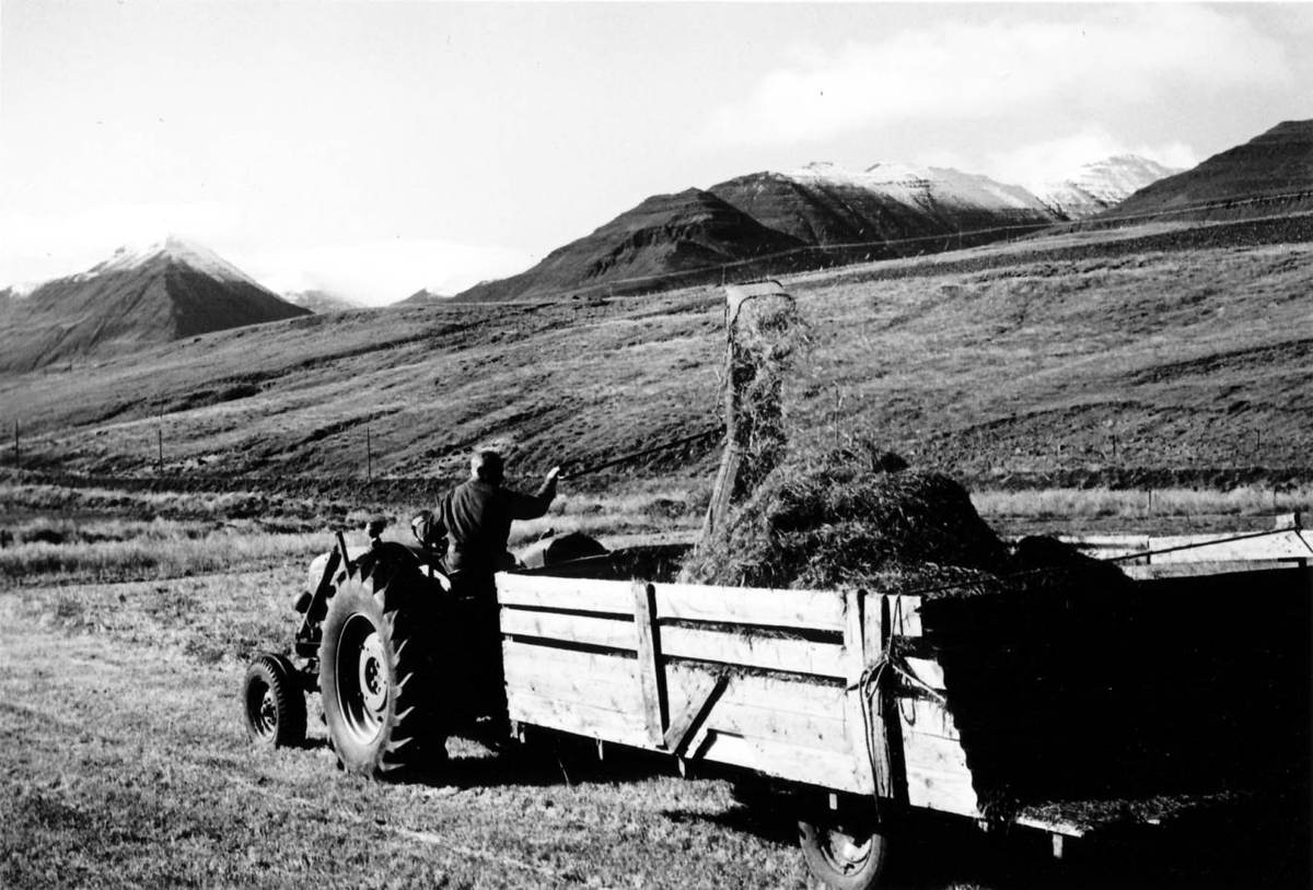 Jón bóndi Espihóli að heyja í vothey á Fordson Major.