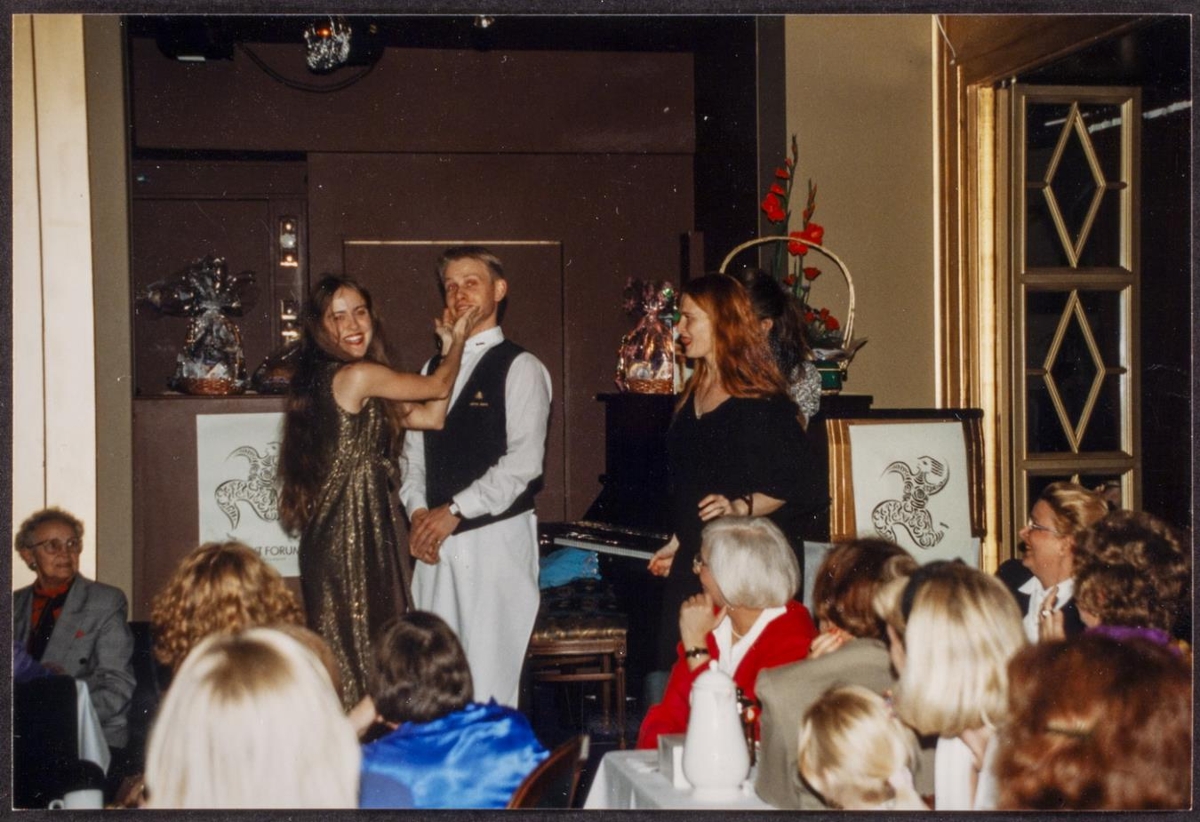 Nordisk Forum 1994. Kynningafundur Hótel Borg, 24. okt. 1993. Fólk situr á fundi. Karlmaður og kona með skemmtiatriði.