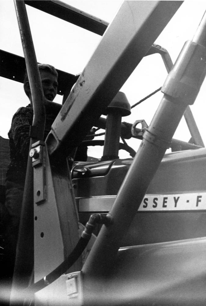 Addi í Garði, ábyrgur á svip tekur í spottann og sturtar af heygaflinum.