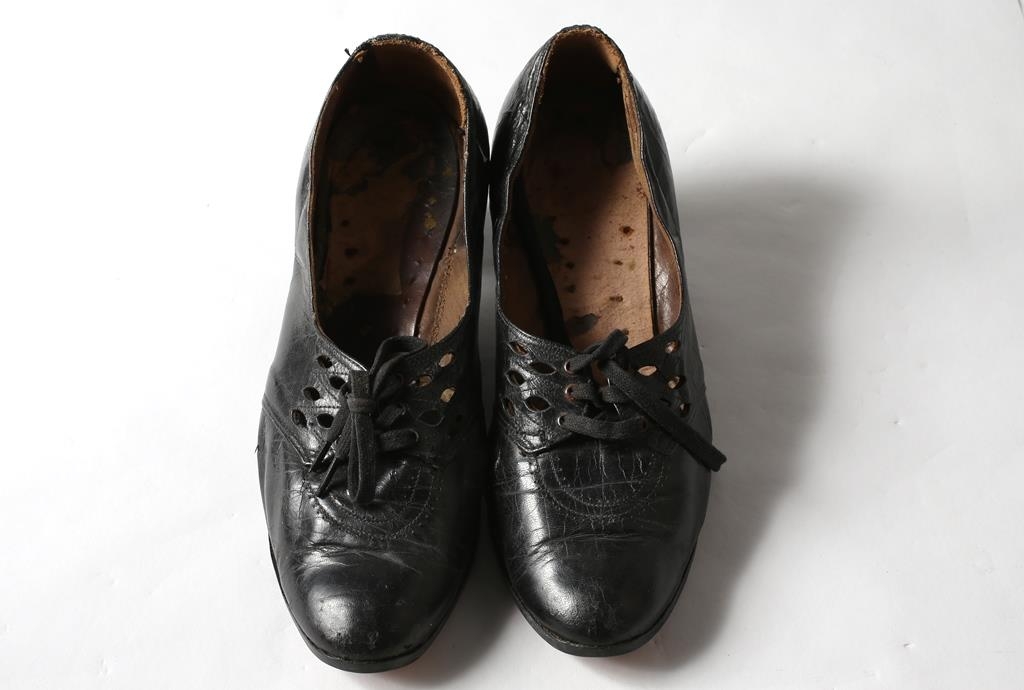Svartir skór með frekar lágum hæl og gatamynstri að framan og á reimum og tungu. Eru í stærð 39. Hafa verið viðgerðir, sólaðir með leðursólum og er skrifað "Dísa Jóns" undir annan. Móðir gefanda, Þórdís Jónsdóttir í Höfn, átti skóna.