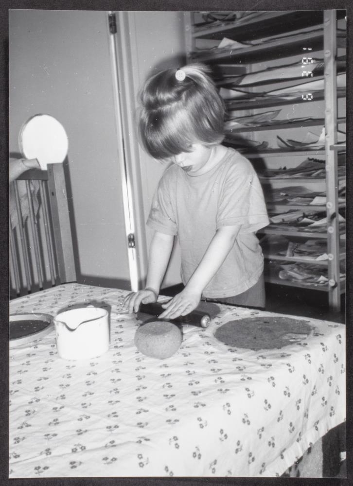 Leikskólabörn búa til pappír. Lítil stelpa að föndra.