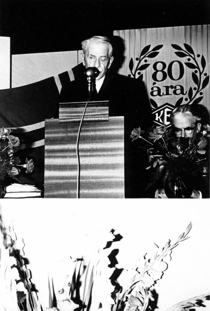 Stjónarformaður KEA, Brynjólfur flytur skýrslu stjórnar á aðalfundi 1966, fundarstjóri Gísli Konráðsson við hans hlið.