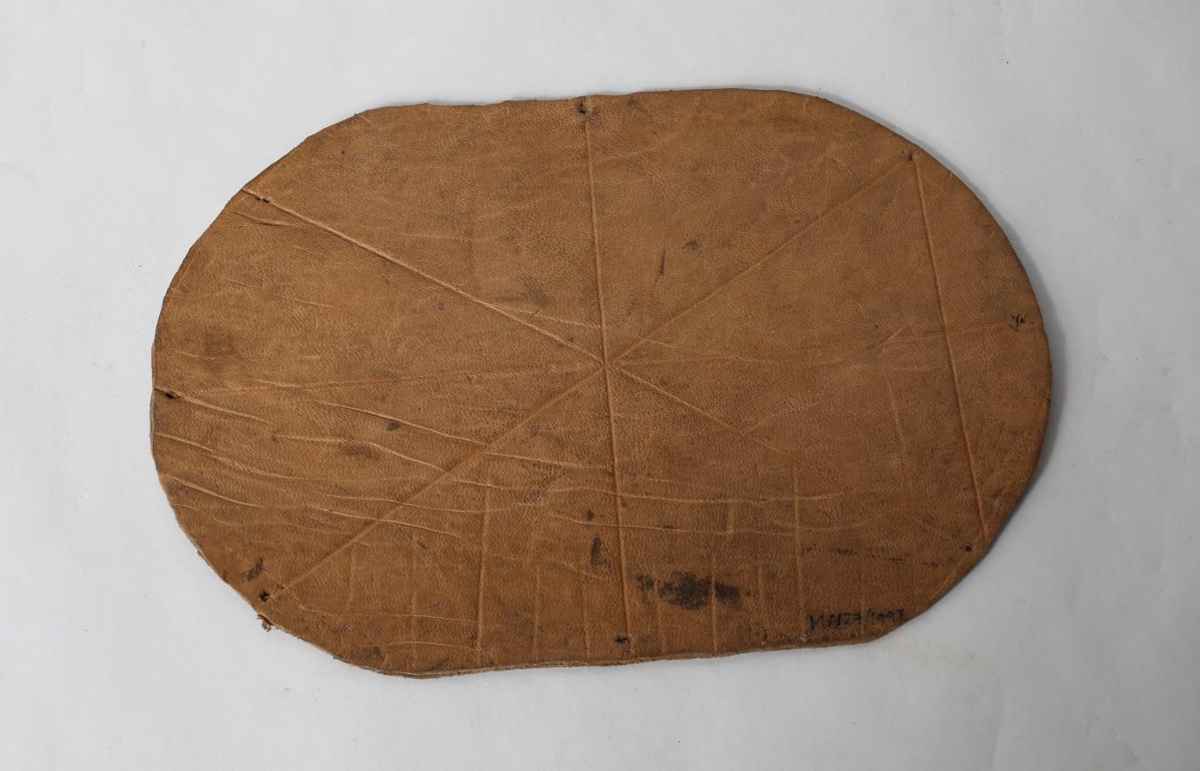Brúnn leðurbútur með krossi og götum meðfram kanti. Elt skinn. Faðir gefanda, Óli Einarsson (f.22.8.1878 d.18.11.1965), bóndi og söðlasmiður frá Þingmúla í Skriðdal átti söðlasmíðaáhöldin og það sem með fylgdi. Óli vann við söðlasmíði frá unga aldri og öll sín búskaparár.