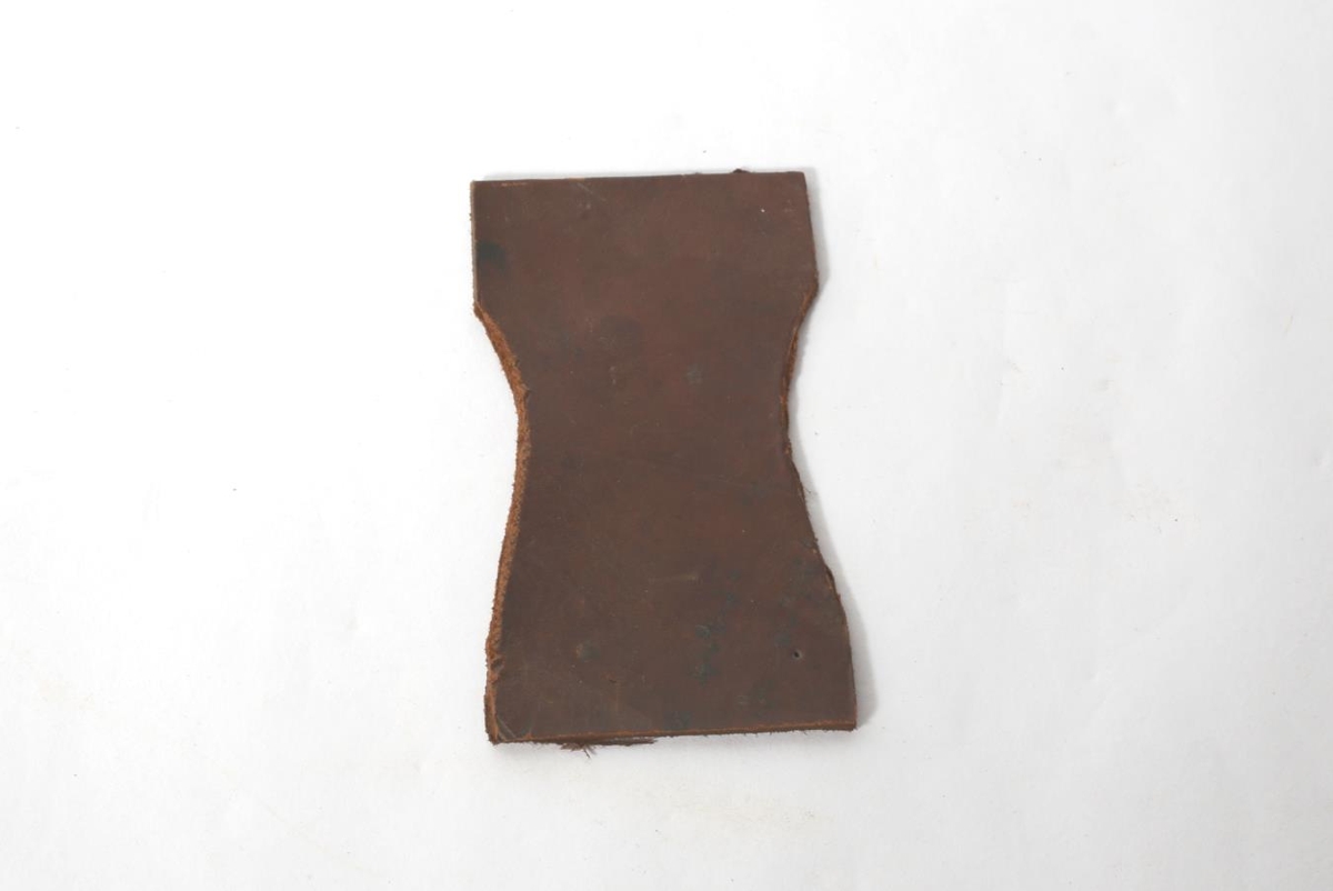 Brúnn leðurbútur, harður. Faðir gefanda, Óli Einarsson (f.22.8.1878 d.18.11.1965), bóndi og söðlasmiður frá Þingmúla í Skriðdal átti söðlasmíðaáhöldin og það sem með fylgdi. Óli vann við söðlasmíði frá unga aldri öll sín búskaparár.