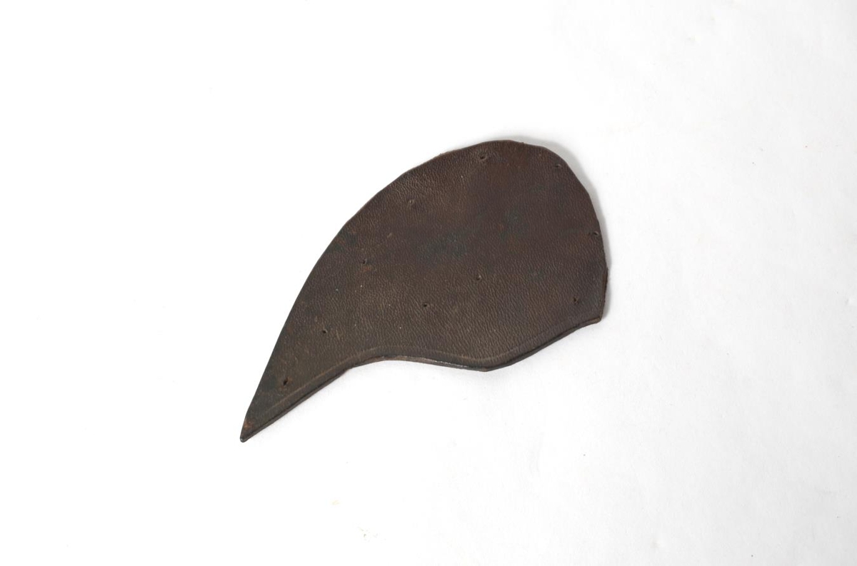 Brúnn leðurbútur með götum meðfram kanti. Óelt? (hart). Faðir gefanda, Óli Einarsson (f.22.8.1878 d.18.11.1965), bóndi og söðlasmiður frá Þingmúla í Skriðdal átti söðlasmíðaáhöldin og það sem með fylgdi. Óli vann við söðlasmíði frá unga aldri öll sín búskaparár.