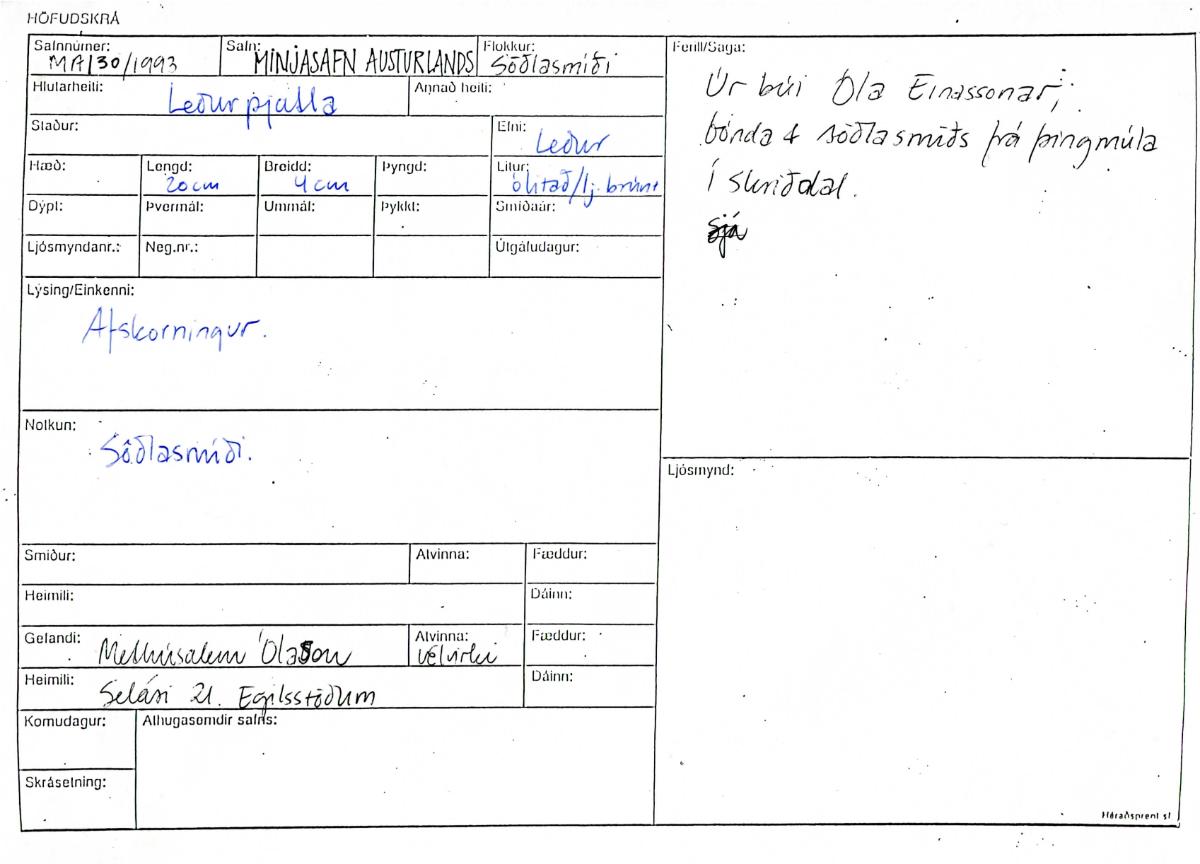 Afskorningur. Faðir gefanda, Óli Einarsson (f.22.8.1878 d.18.11.1965), bóndi og söðlasmiður frá Þingmúla í Skriðdal átti söðlasmíðaáhöldin og það sem með fylgdi. Óli vann við söðlasmíði frá unga aldri öll sín búskaparár.