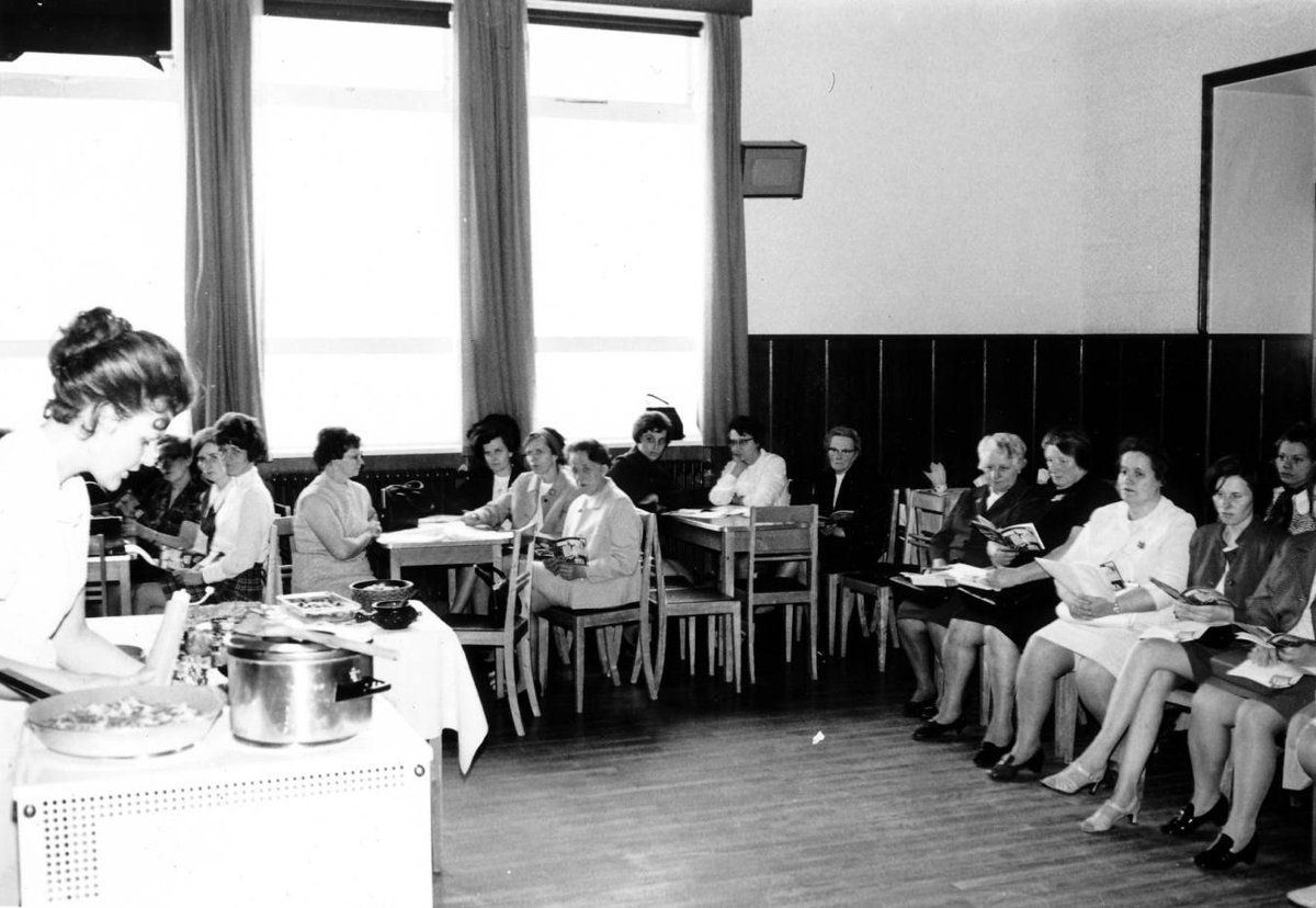 Guðríður Eiríksdóttir húsmæðrakennari, að kenna húsmæðrum í Öngulsstaðahreppi matreiðslu.