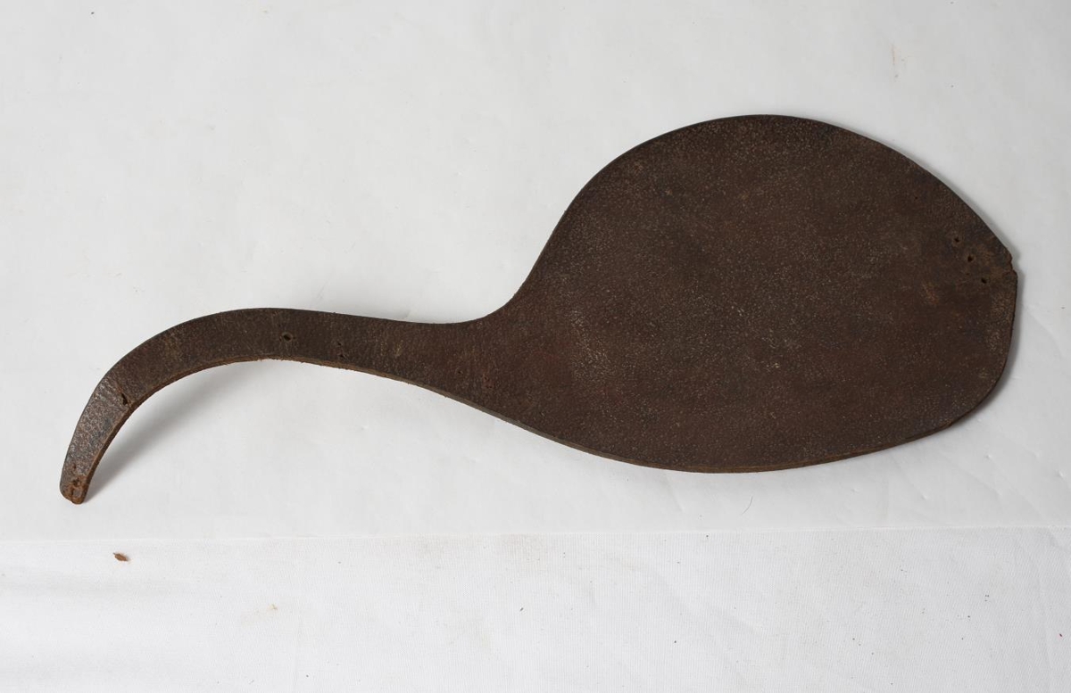 Brún leðurpjatla með nokkrum götum. Kringlótt með langri ræmu út úr. Faðir gefanda, Óli Einarsson (f.22.8.1878 d.18.11.1965), bóndi og söðlasmiður frá Þingmúla í Skriðdal átti söðlasmíðaáhöldin og það sem með fylgdi. Óli vann við söðlasmíði frá unga aldri og öll sín búskaparár.