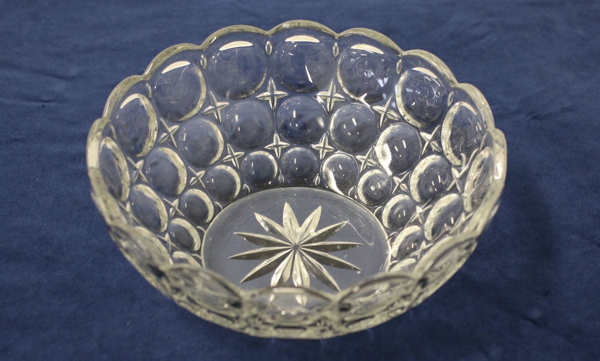 Djúp glær skál með mynstri sem myndar hringi. 12 arma stjarna í botni. Úr búi foreldra gefanda. Var alltaf notuð undir jólagrautinn, sem var blandaður ávaxtagrautur með rjóma.