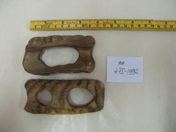 Tvær hagldir úr horni, með tveimur götum hvor. Úr Freyshólabúinu.
