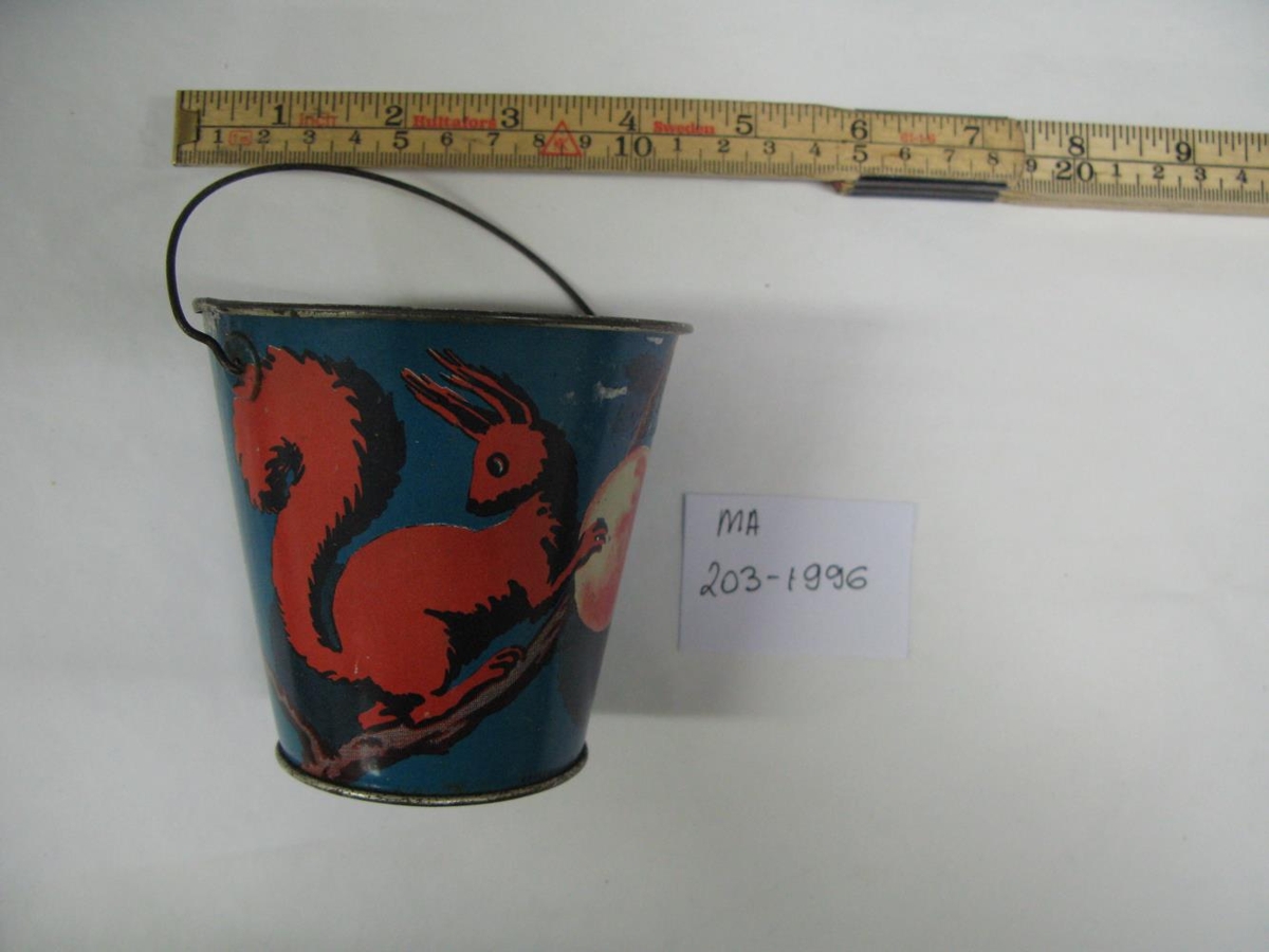 Blá barnafata með haldi úr járni, mynd af kráku og íkorna framan á. Gyllt að innan. Berjafata Freyshólasystkina frá því um 1935. Úr eigu Ljósbjargar Magnúsdóttur.