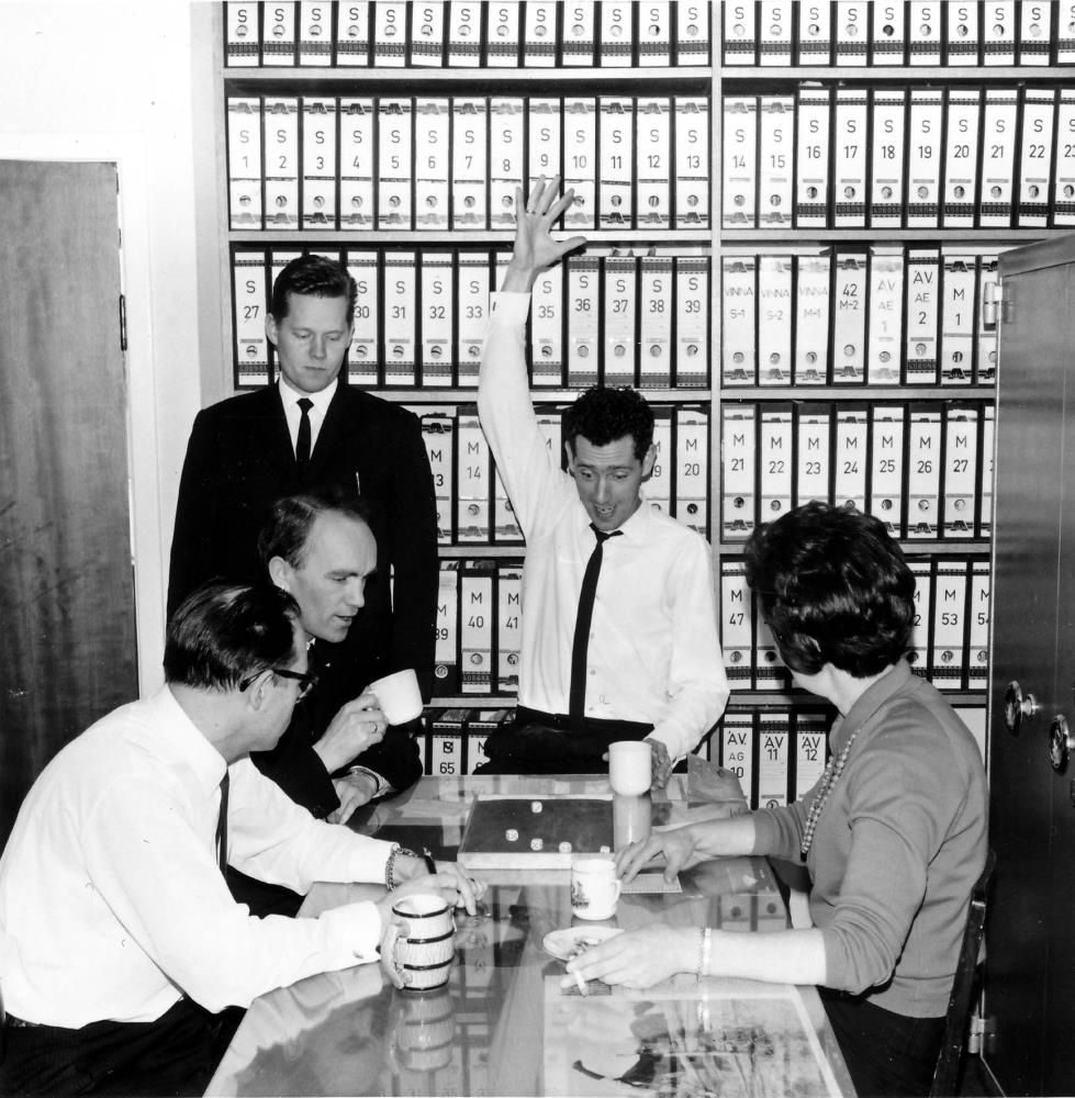 Teningum kastað, og Jón vinnur. Kaffitíminn vel nýttur hjá bókhaldsfólki KEA.