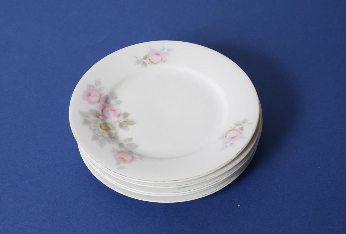 Hvítur desertdiskur með tveimur bleikum rósum og einum rósaklasa. Úr búi foreldra gefanda. Brúðargjöf, þau giftu sig 13. júní 1926. Úr 6 manna stelli. Teskeiðar frá sama gefanda fylgja stellinu.