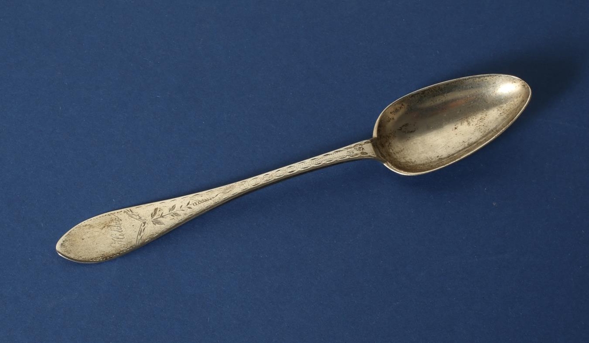 Silfurmatskeið með handgröfnu mynstri og áletruð "Hildur". Úr eigu Hildar Stefánsdóttur, húsfreyju á Freyshólum, móður Huldu. Stimpill aftaná skeiðinni er BP og er skeiðin smíðuð af Birni Pálssyni, Refsstað.