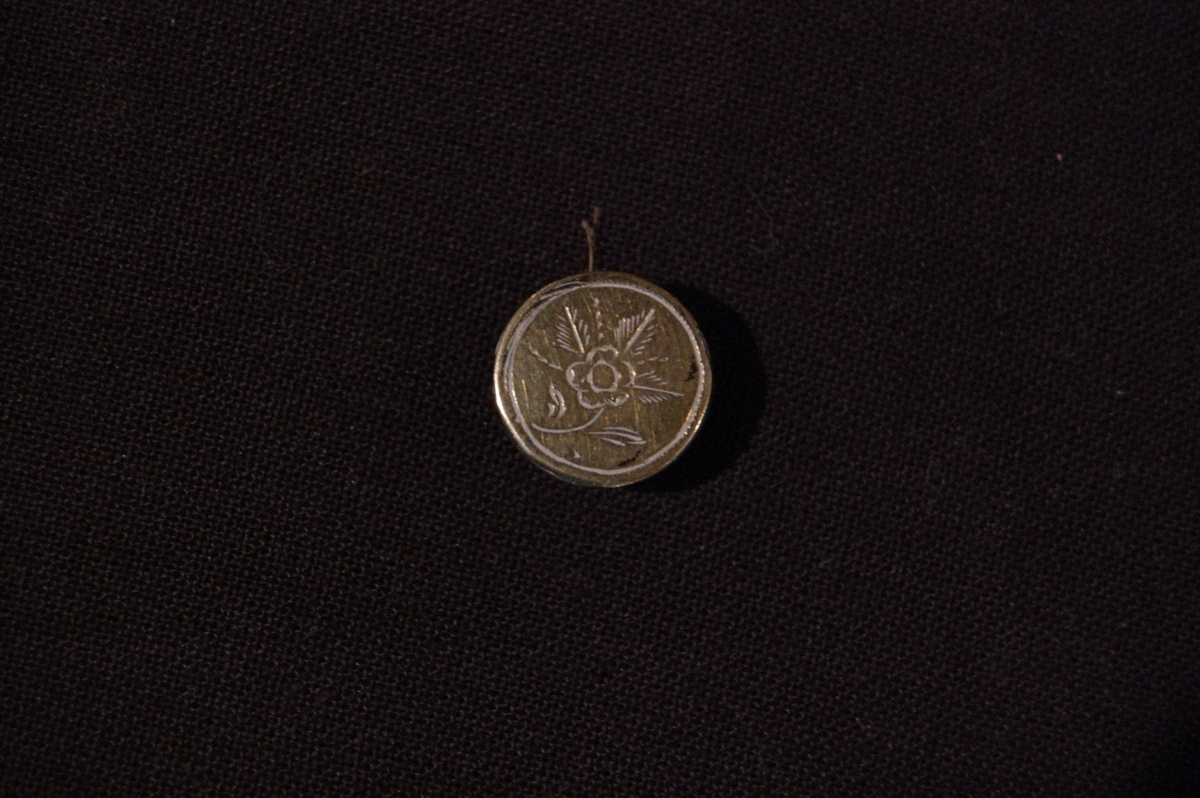 Gylltur svuntuhnappur, flatur með ágröfnu rósamynstri. Amma og/eða langamma gefanda áttu hnappinn. Stimplaður með stöfunum B.P. og að öllum líkindum hefur Björn Pálsson gullsmiður á Refsstað gert þennan hlut.