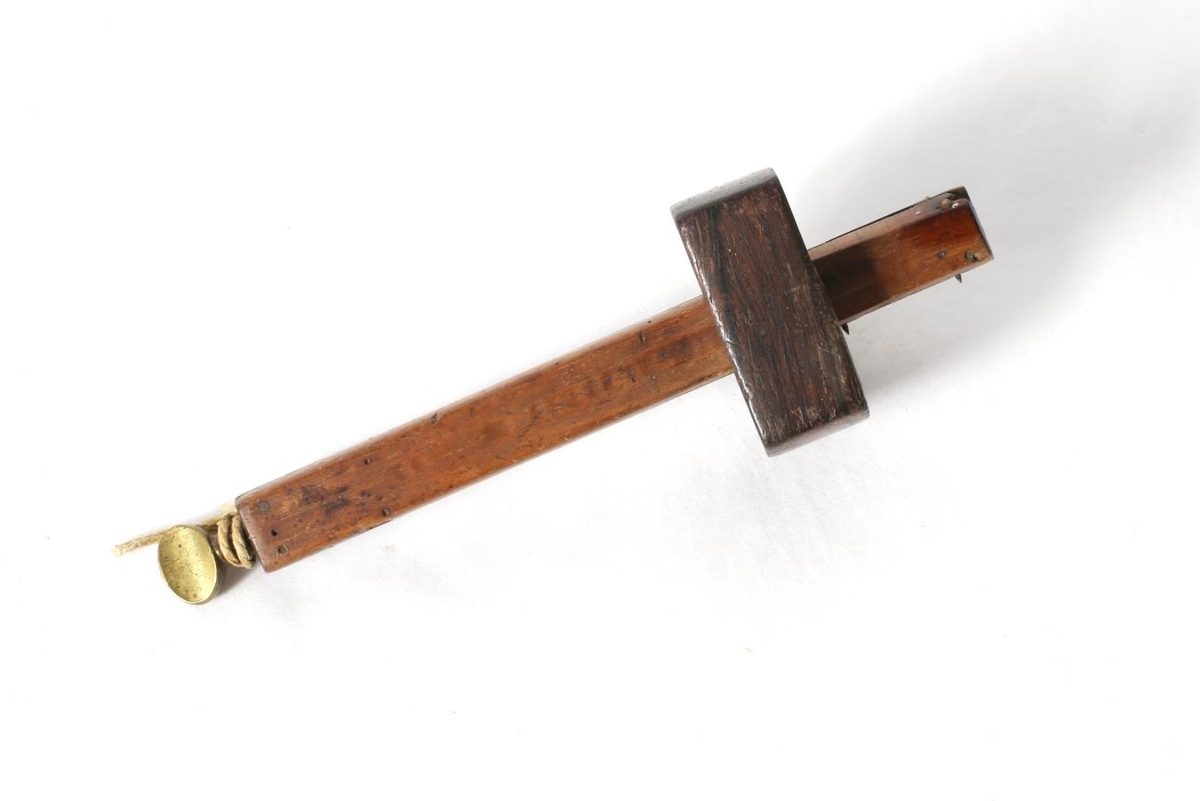 Lítil tréstöng með færanlegum trékubbi á koparslegnum og koparherslum. Úr Freyshólabúinu.