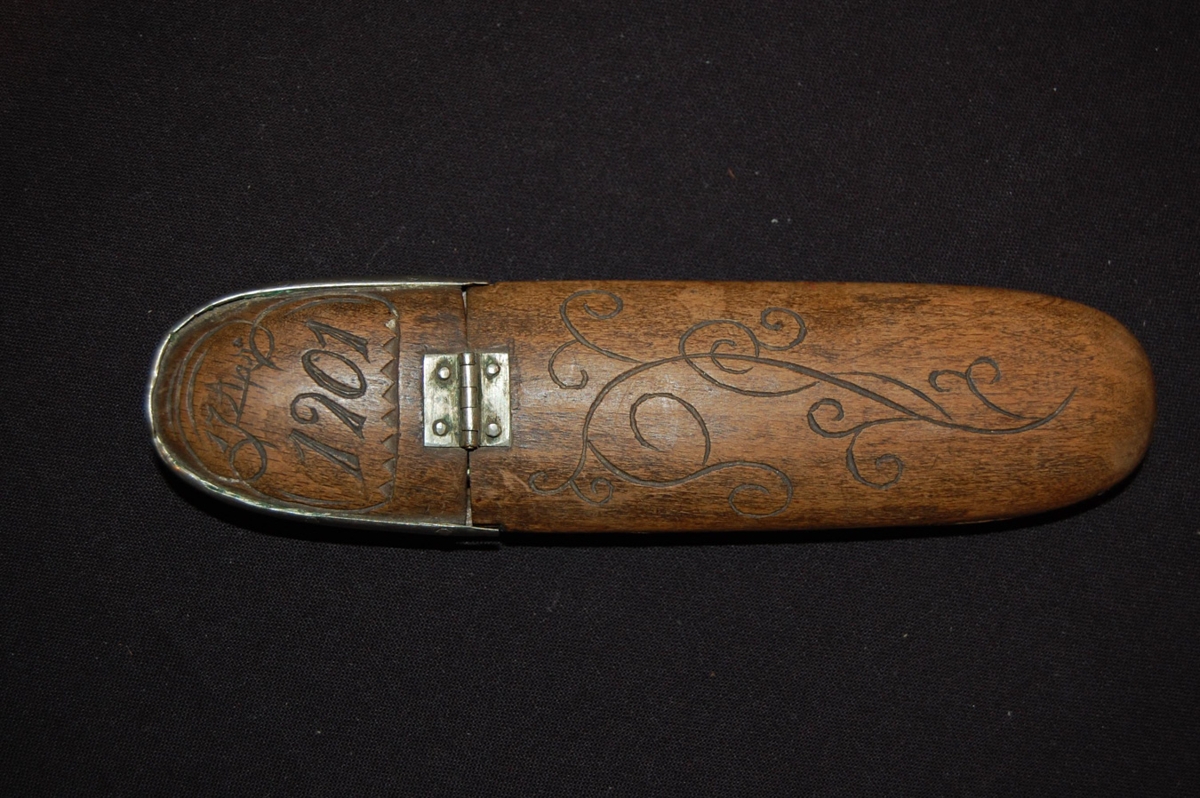 Brúnt gleraugnahús úr harðviði, opnast með löm að hluta til að ofan. Hulstrið er rúnnað til endanna og kúpt. Skorið er ofan í það lykkjumynstur, mánaðardagur og ártal við lömina: "17. apríl 1901", á bakhlið: "Ljósbjörg Magnúsdóttir", með einföldu skrauti í kring. Eigandi var langamma gefanda, Ljósbjörg Magnúsdóttir (f.08.01.1848), húsfreyja á Freyshólum í Vallahreppi. Guðjón Jónsson, snikkari á Reyðarfirði, hagur bæði á járn og tré, sonur Ljósbjargar smíðaði gleraugnahúsið. Gleraugun fylgja, safnnúmer MA 1996-117.