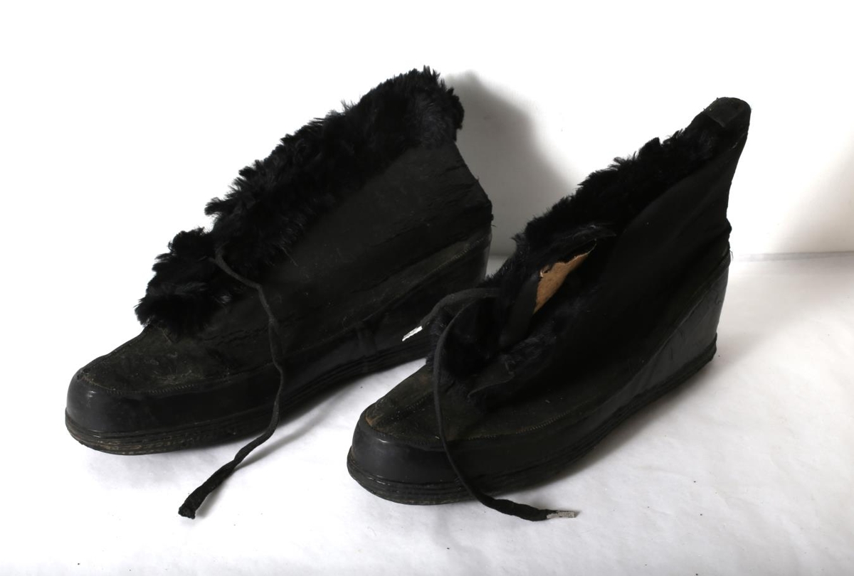 Kvenbomsur, svartar með fylltum hæl og með loðkanti að ofan. Kom frá Freyshólum á Völlum.