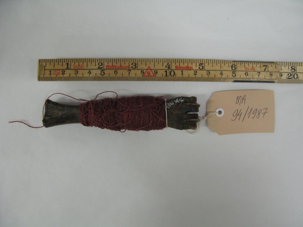 Brúnn og rauðbleikur. Á honum er togþráður, mjög fínspunninn. Var notaður sem útsaumsgarn m.a. í sessu sem gefandi man eftir. Þráðurinn er dökkrauðbleikur eða fjólublár á litinn. Þráðinn spann Salný Jónsdóttir frá Snjóholti, húsfreyja í Freyshólum, langamma gefanda.