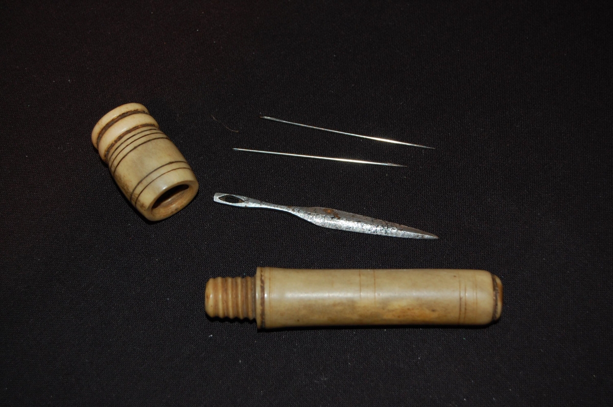 Nálhús úr renndu horni, skrautrendur. Lok skrúfað á. Í eru tvær saumnálar og stór skónál. Móðir gefanda, Helga Jónsdóttir átti nálhúsið. Hún saumaði eitthvað fram á fimmta áratuginn.