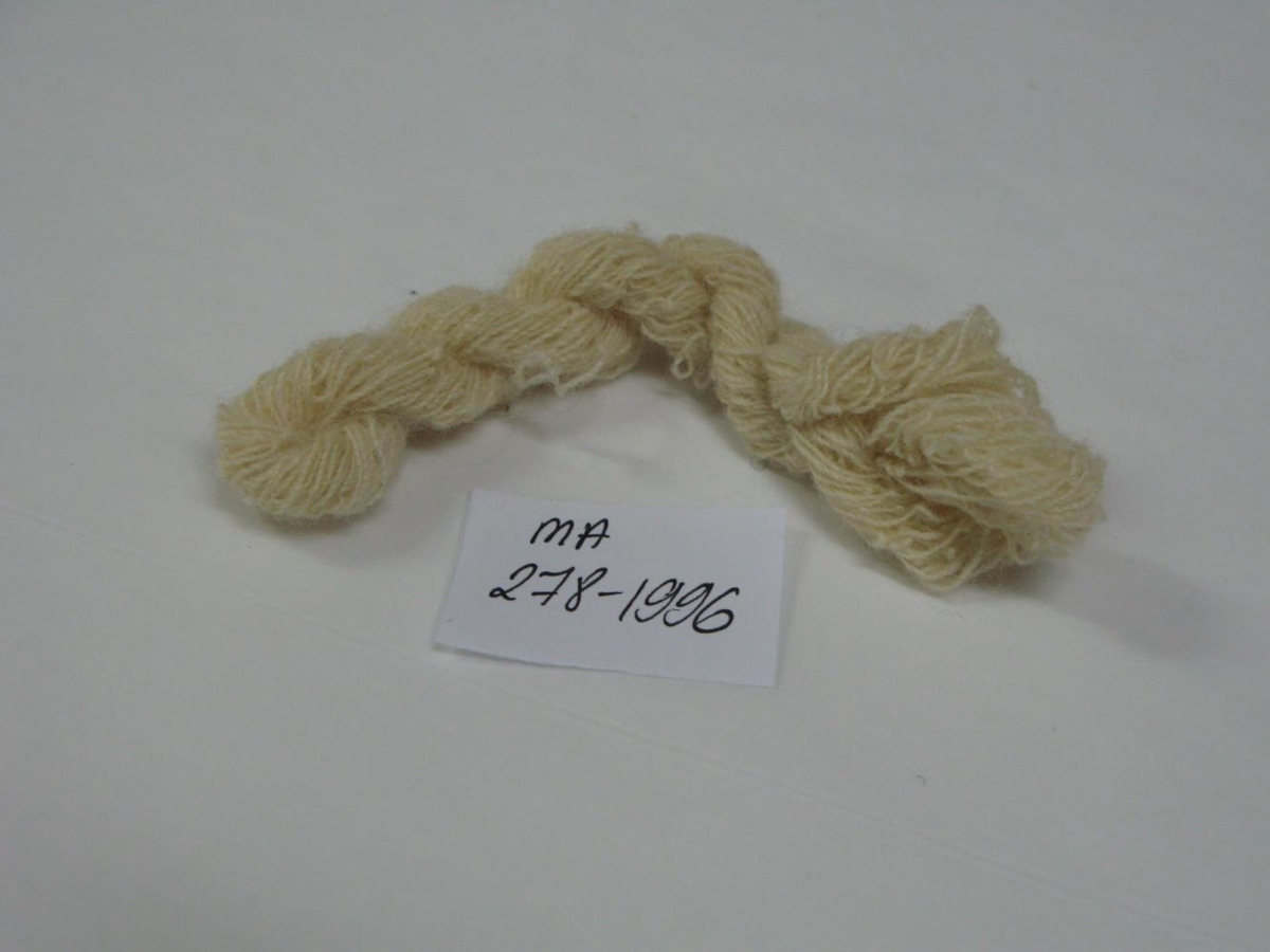 Tvinnað band, hvítt og mórautt. Unnið af Sigurveigu Kristjánsdóttur frá Eyjólfsstöðum.