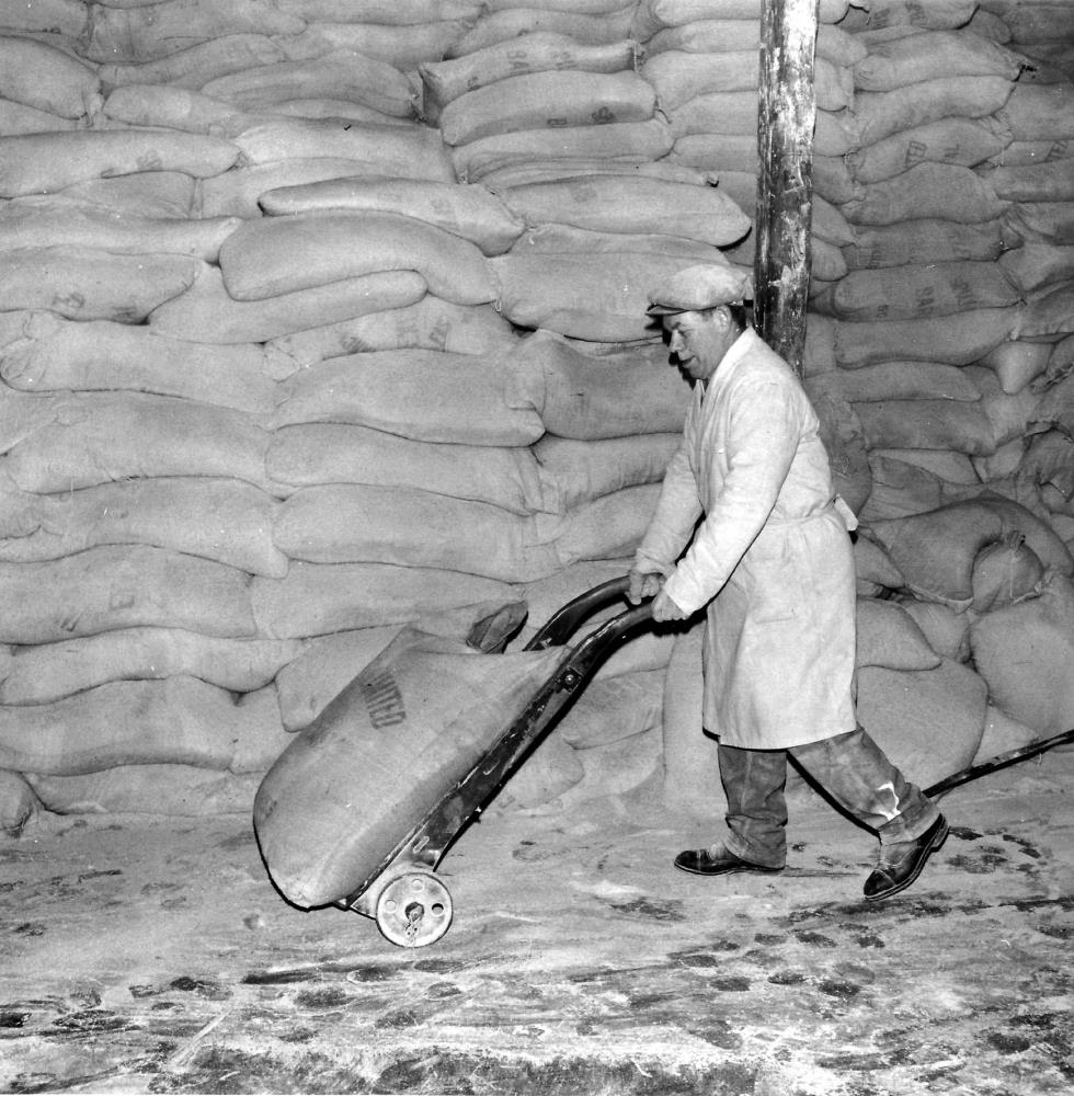 Finnur að afgreiða 50 kg. fóðurblöndupoka.