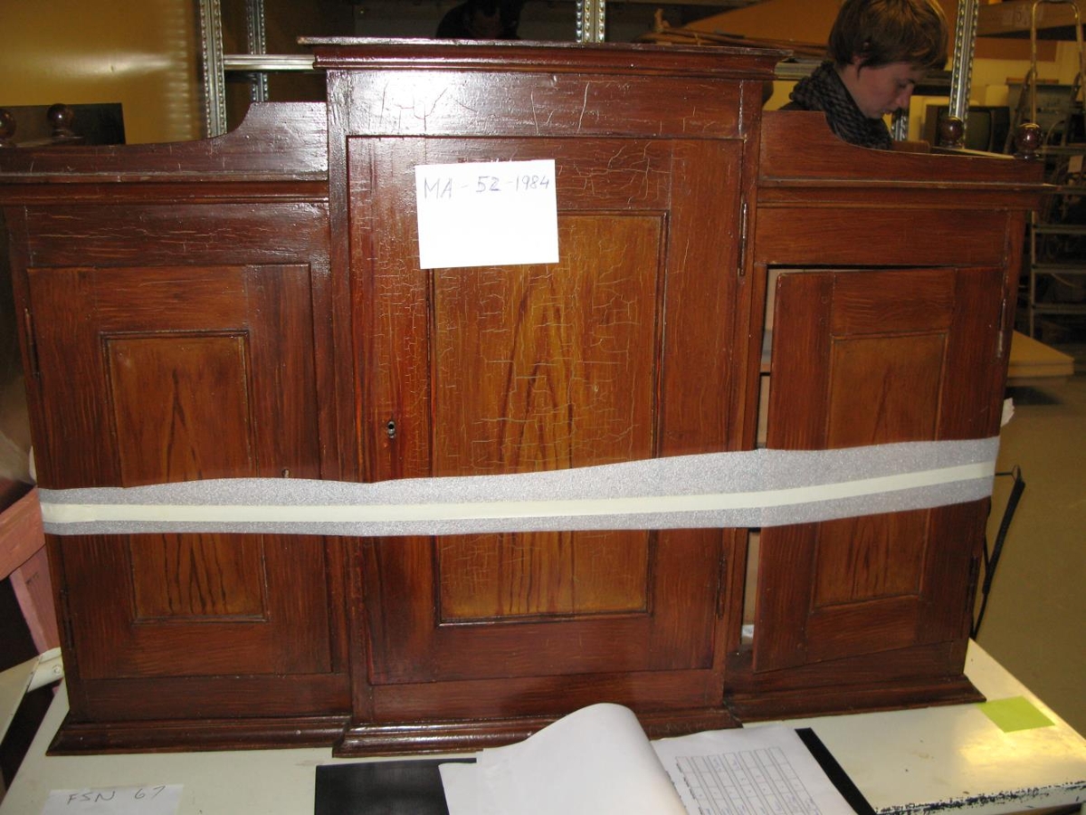 Rauðbrún með fjórum skúffum og þrískiptum hólfum. Samsett úr þremur hlutum. Úr búi Guttorms Pálssonar, skógarvarðar á Hallormsstað (f.12.07.1884 - d.05.06.1964), foreldra hans og móðurforeldra. 12.12.2013.