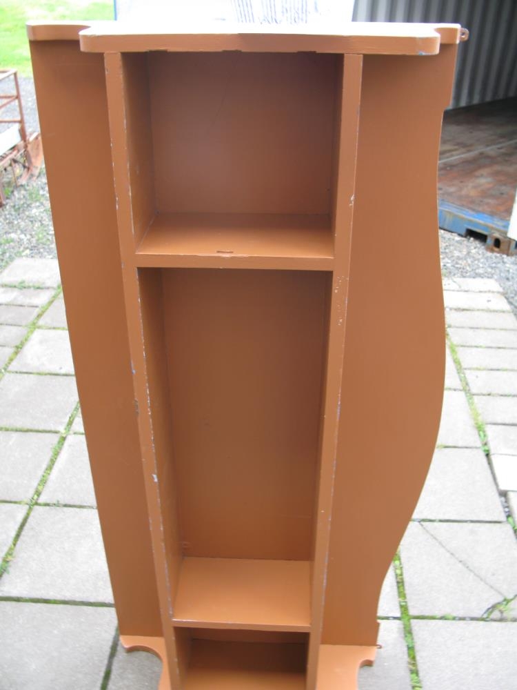 Brún bókahilla. Var upphaflega brúnbæsuð en síðan verið margmáluð. Hefur verið með lokuðum hirslum á sitthvorum enda en löngu er búið að fjarlægja hurðirnar. Svona hilla var í hverju herbergi. Þessi er merkt: Nunnusetur nr. 7. Notuð undir bækur og fleira. Kom frá Hússtjórnarskólanum á Hallormsstað. Framleiðandi: Sigurður Guttormsson á Hallormsstað. Gerð á árunum 1954-1958.