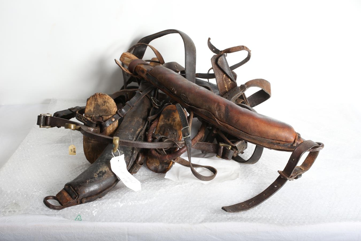Svört leðuraktygi með tréklafa. Bólstrunin á klöfunum farin að losna frá, ástand annars gott. Frá Hrafni á Hallormsstað.