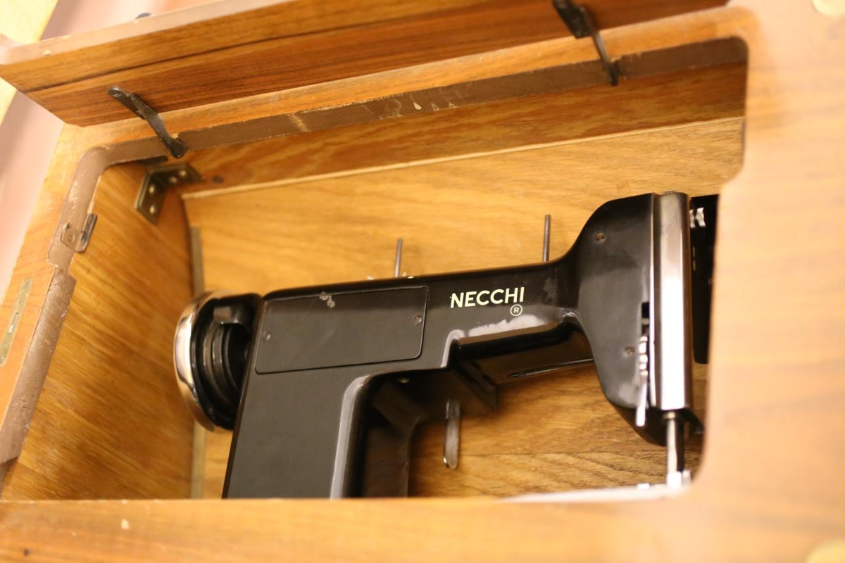 Fótstigin Necchi saumavél í fallegum skáp. Úr dánarbúi foreldra gefandans, Hrafns og Þórnýjar. Notað til fatagerðar o.fl. Made in Italy.