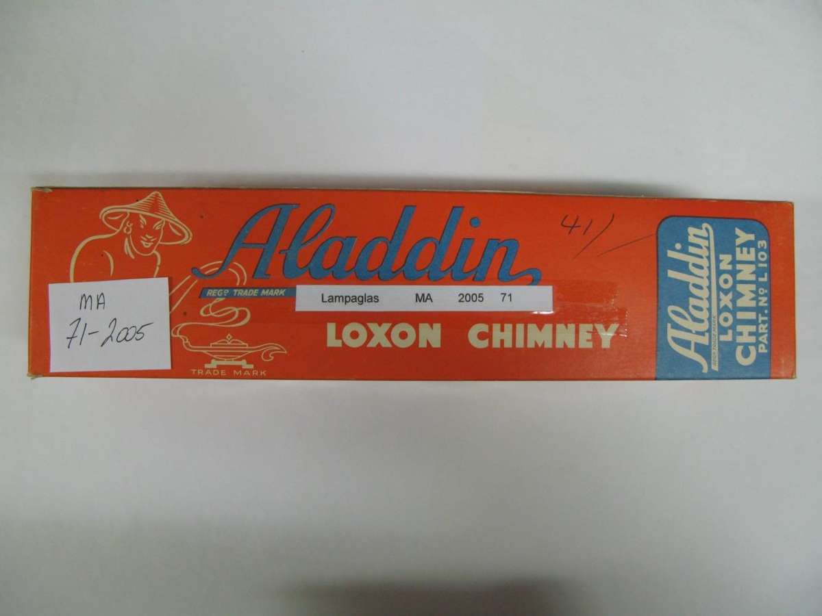Nýtt glært lampaglas í pakkningu. Fylgihlutur með Aladdin lampa. Made in U.S.A. Úr búi Þórnýjar Friðriksdóttur og Hrafns Sveinbjarnarsonar, Hjalla Hallormsstað. Sigrún dóttir þeirra seldi húsið árið 2005 og flutti til Egilsstaða.