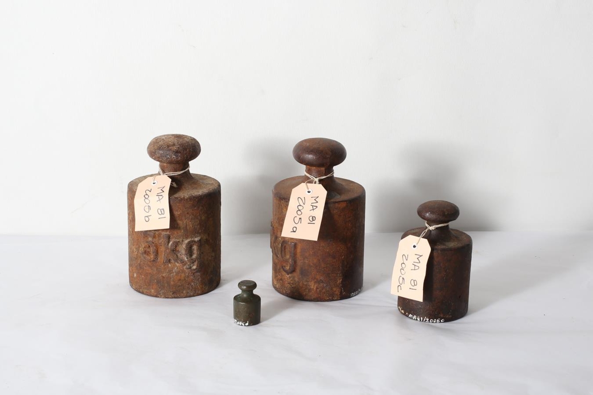 Fjögur lóð. a) 5 kg, áletrun: 1885. b) 5 kg. c) 2 kg, áletrun: 1935. d) Áletrun: 8 Lod - N H V. Fylgihlutir með vigt. Úr búi Þórnýjar Friðriksdóttur og Hrafns Sveinbjarnarsonar, Hjalla Hallormsstað. Sigrún dóttir þeirra seldi húsið árið 2005 og flutti til Egilsstaða.