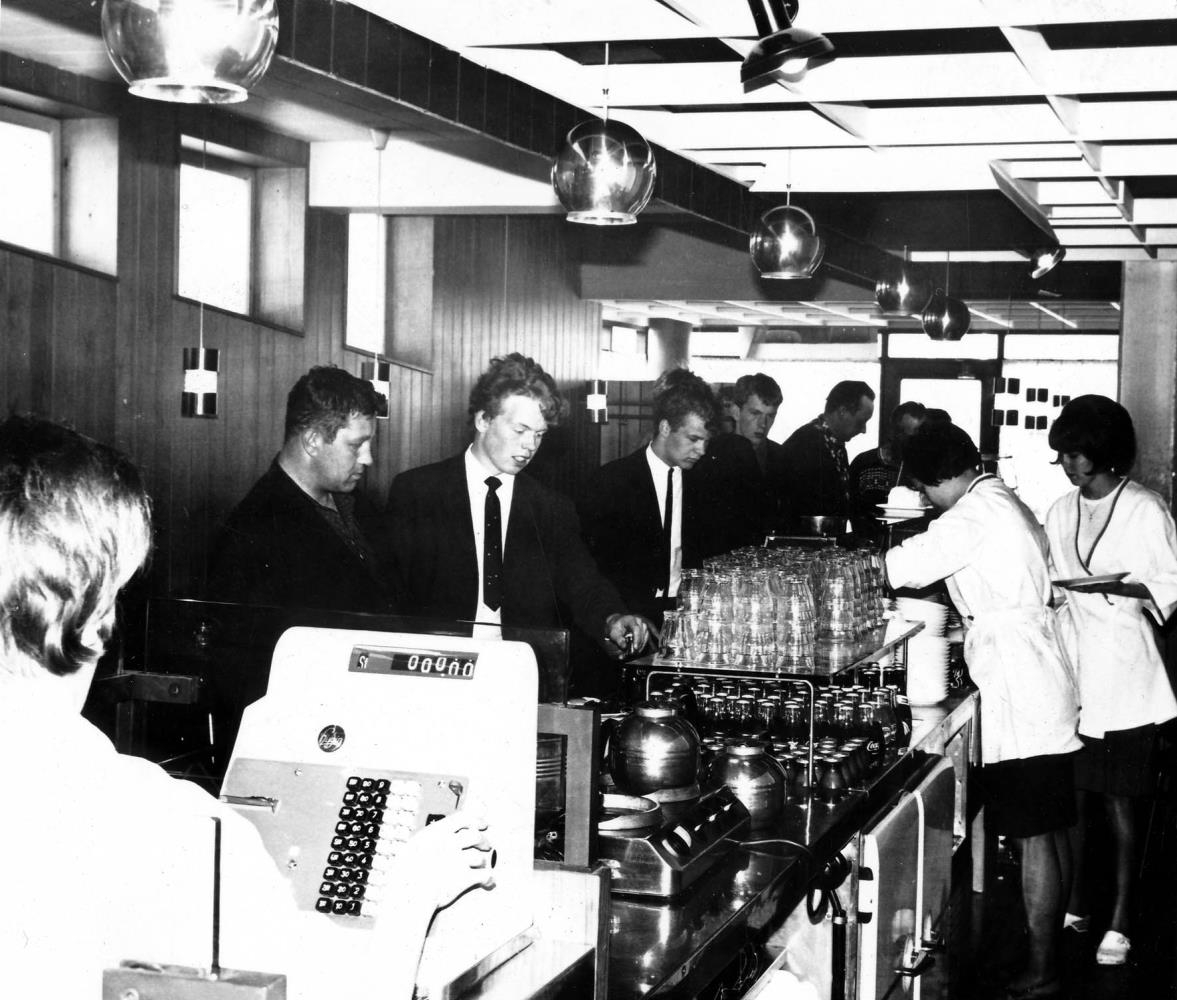 Kaffiterían, Sævar nr.3 í röð frá vinstri, og Helga starfsstúlka lengst til hægri.