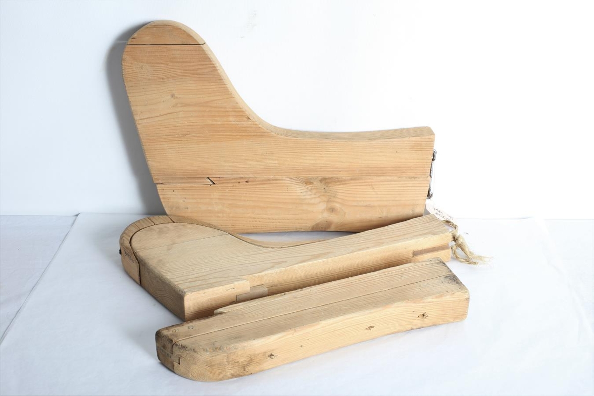 Fótlagatré/sokkatré. Notað til að móta sokka. Úr búi Þórnýjar Friðriksdóttur og Hrafns Sveinbjarnarsonar, Hjalla Hallormsstað. Sigrún dóttir þeirra seldi húsið árið 2005 og flutti til Egilsstaða.