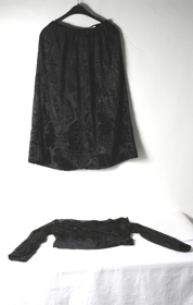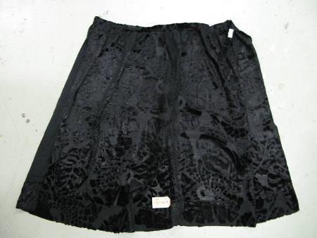 Upphlutsvunta úr svörtu næloni með upphleyptum svörtum blómum og laufblöum. Vantar hnappinn á hneppsluna. Með svuntunni á að fylgja falleg svört blúndutreyja. Kom frá Höfða.