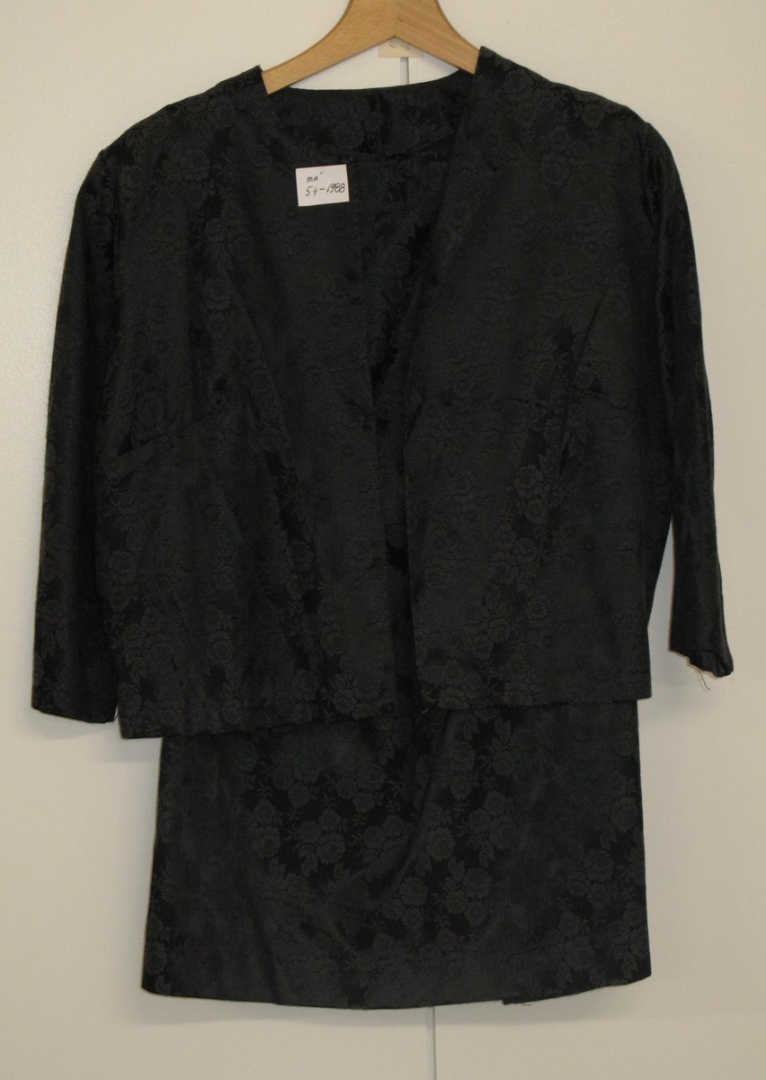 Pils og treyja úr bómullarefni með silkiáferð, með samlitu blómamynstri. Pilsið er beinsniðið, lítil klauf aftan á. Hliðarklauf með rennilás. Treyjan er langerma, bein í sniðum með rúnnuðu hálsmáli. Fötin virðast ónotuð. Á þeim eru miðar hvar á stendur "LOT-SIZE 18". Frá Höfða.