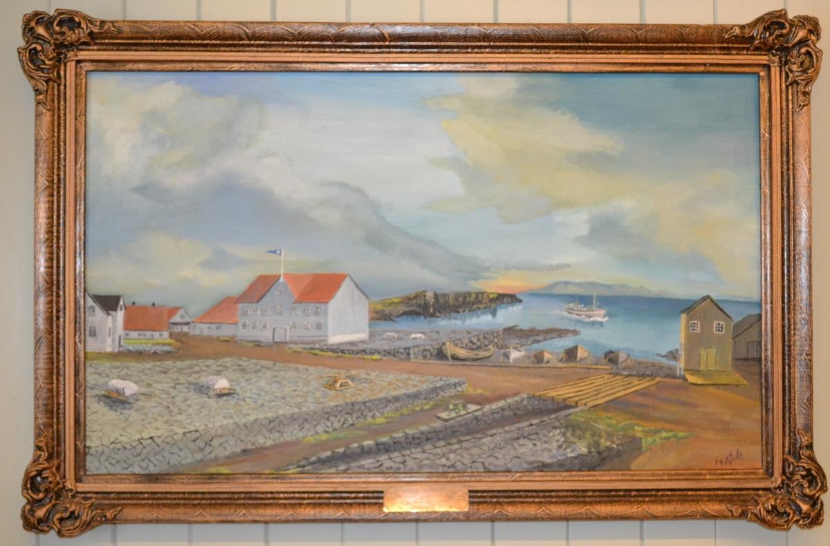 Málverk af Duus húsum . Málað 1954 af Arinbirni Þorvarðarsyni. Á rammanum er skjöldur sem á er grafið: "Byggðasafn Suðurnesja 1981. Gefið af böfnum Maríu og Erlendar Jónssonar Vesturgötu 7."