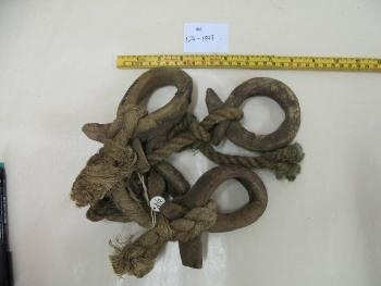 Fjórar ljósar hornhagldir (giftarhagldir) á reipaspotta. Allar giftar, þ.e kræktar saman.