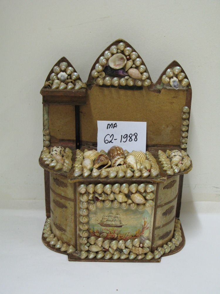 Með loki, alskreytt kuðungum og með mynd af seglskipi að framan.Vantar í skrautið. Útlent. Úr Höfðabúinu .