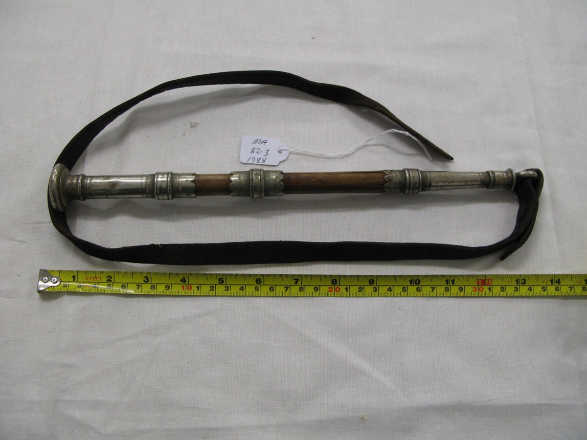Silfurbúið svipuskaft með tveimur hólkum, lítillega munstrað með rifflum. Mikið notuð.