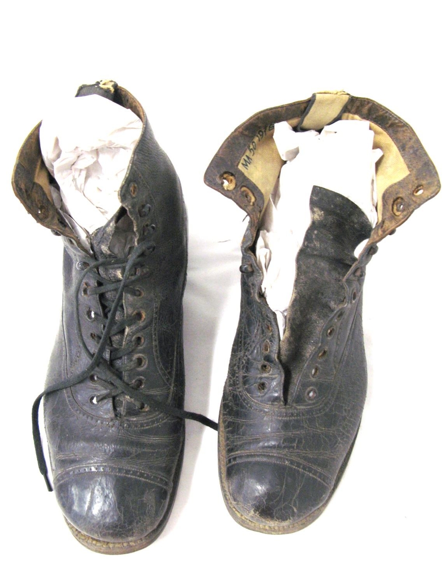 Karlmannaskór, svartir sem ná upp fyrir ökkla. Reimaðir yfir ristina, en síðan krækt í krækjur áfram. Vantar krækjur á annan skóinn og reim. Nokkuð gamlir (fyrir 1930-40)?
