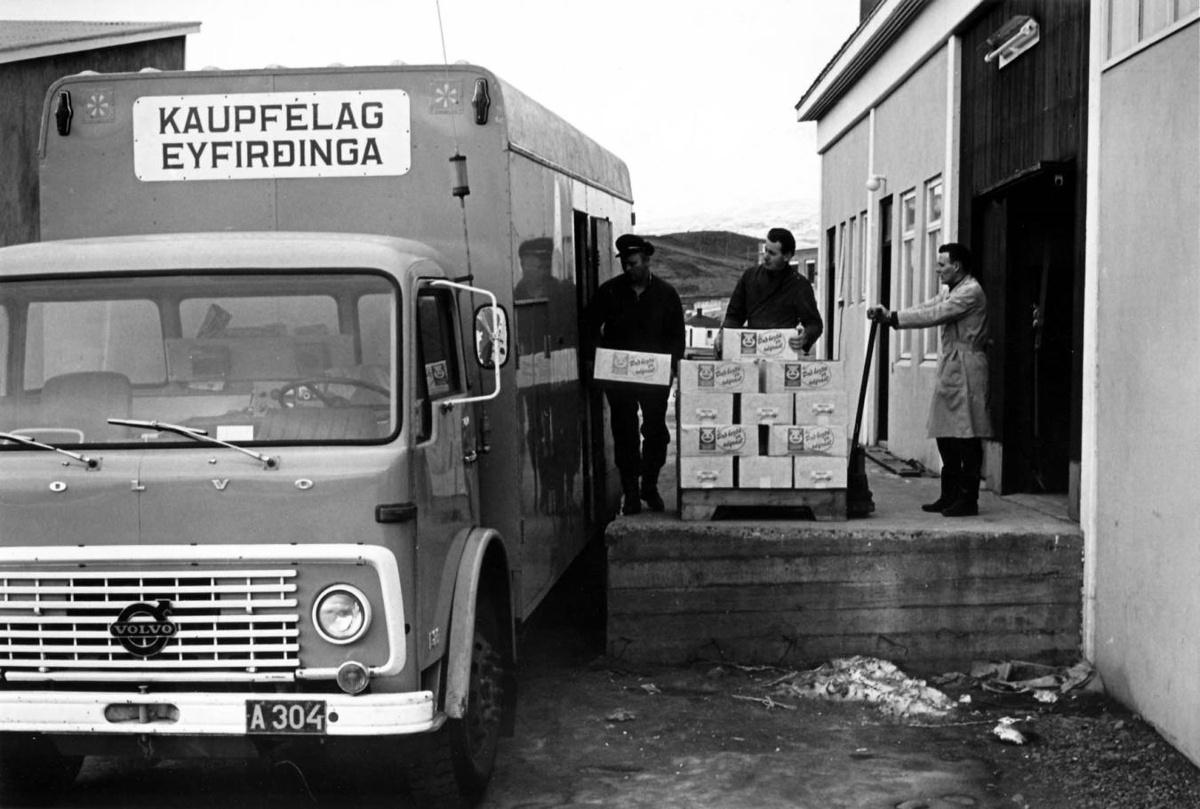Sjafnarmálningu lestað í flutningabíl KEA af lagernum á Hvannavöllum 12.