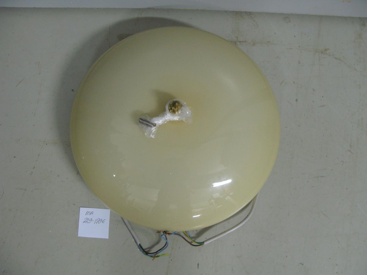 Kringlótt rafmagnsloftljós, gulleitur kúpull með gylltri umgjörð. Úr Hallormsstaðabúinu.