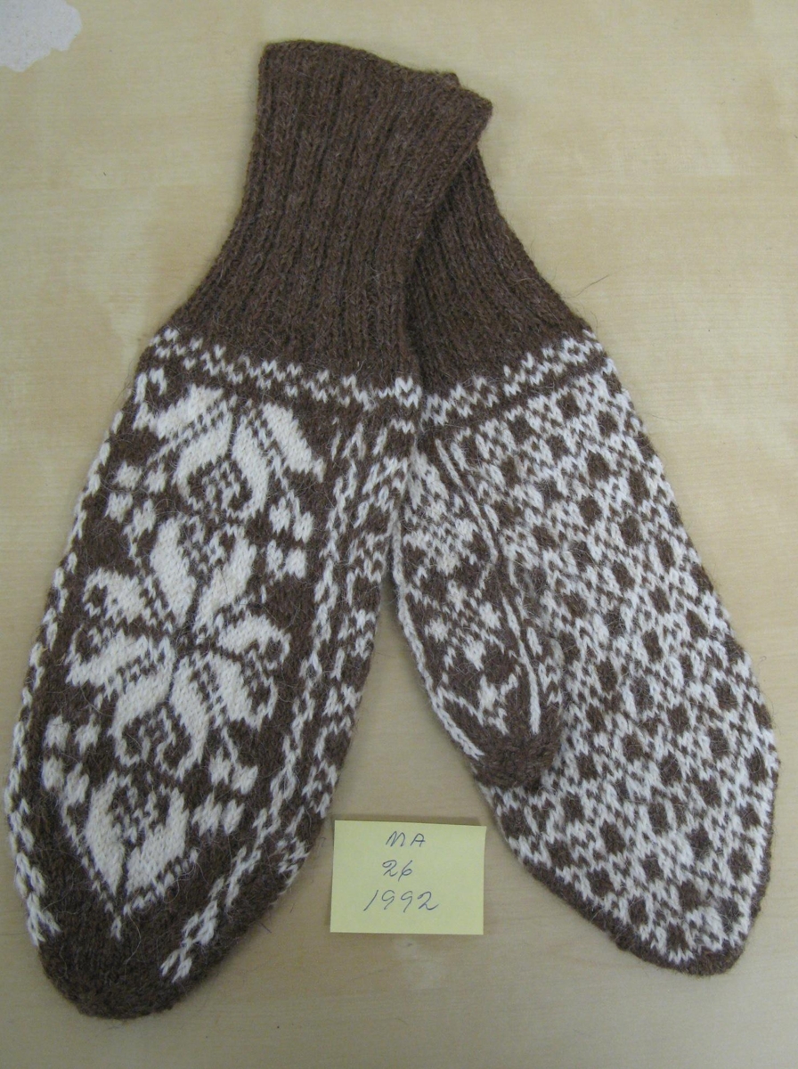 Rósavettlingar, karlmanns. Brúnir í grunninn, hvítt útprjón. Ónotaðir. Anna Gunnarsdóttir (f. 7.5.1899) í Dagverðagerði, prjónaði.